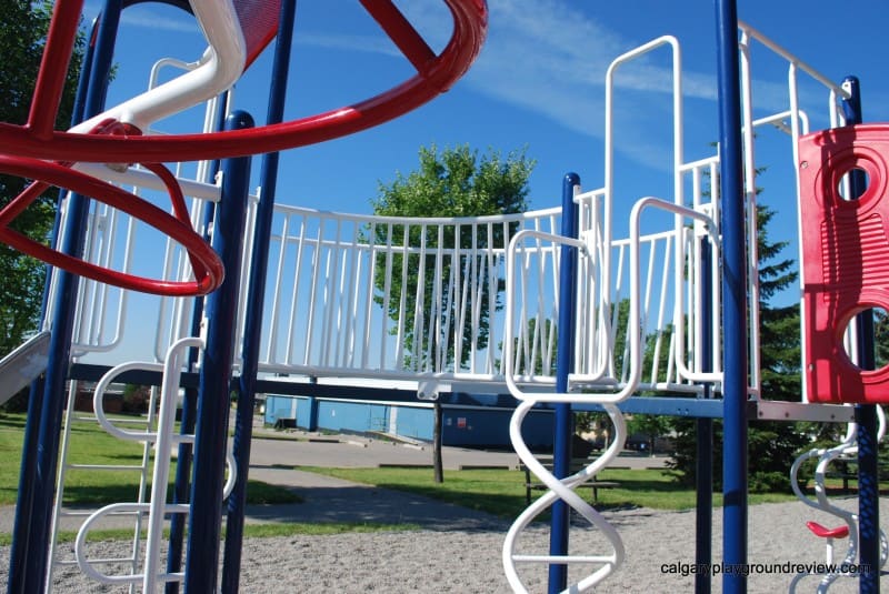 Overall assessment: This playground is really built for school-aged kids. Gordie had trouble accessing anything by himself which is pretty unusual these days. It is not a huge playground, but it’s quite recently built and has some neat features like the red climbing wall pictured below that connects the two halves of the structure.