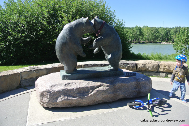 On either side of the river view area you can find a bear sculpture.