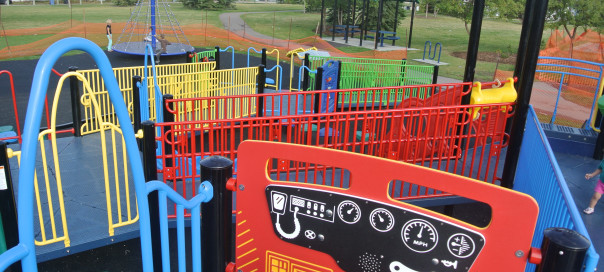 This playground has accessible flooring, a great ramp system and a saucer swing. It’s located in a pretty little park with large trees and a gazebo.