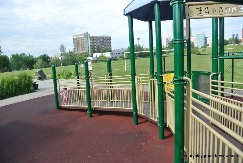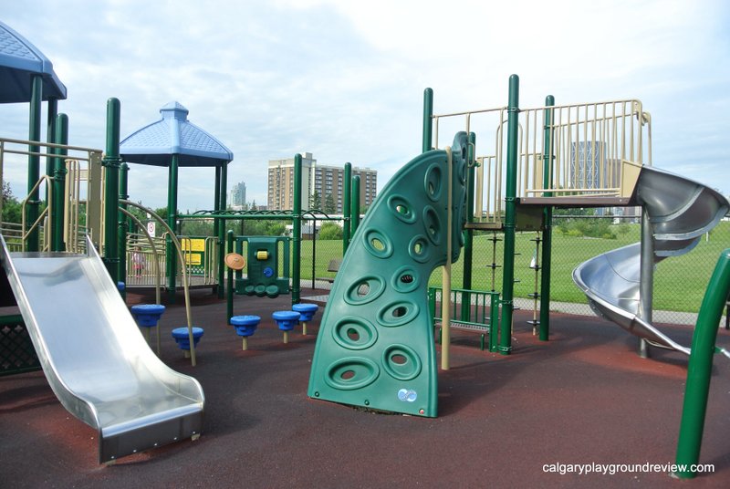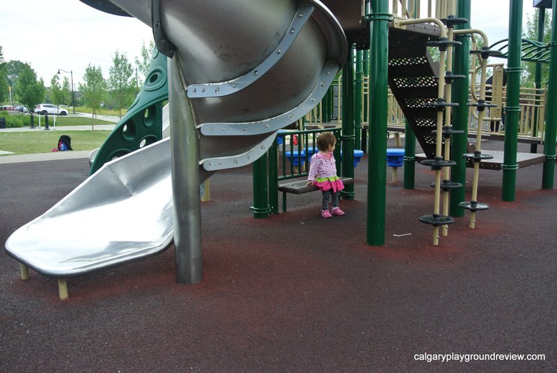 I thought most of this park was great but for some reason the curly slide is dangerous (I know I sounds like a weird paranoid Mom but I’m not). My 4 year old (whom is at tons of playgrounds and I haven’t really had to watch her on a slide since she was two) had a huge fall on the slide. I think she was holding on to a lower railing and slid her feet down, then got scared because her feet twisted too far down (inside of the slide is steep) and then her hands let go and somehow she dropped to the bottom of the slide and smashed her face. I would have chalked it up to some crazy fluke but 10 minutes later another kid at the park did the same thing!