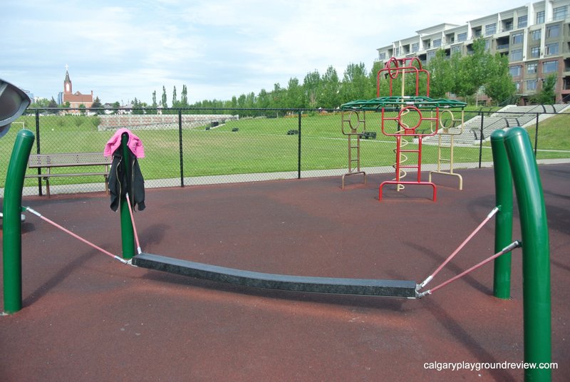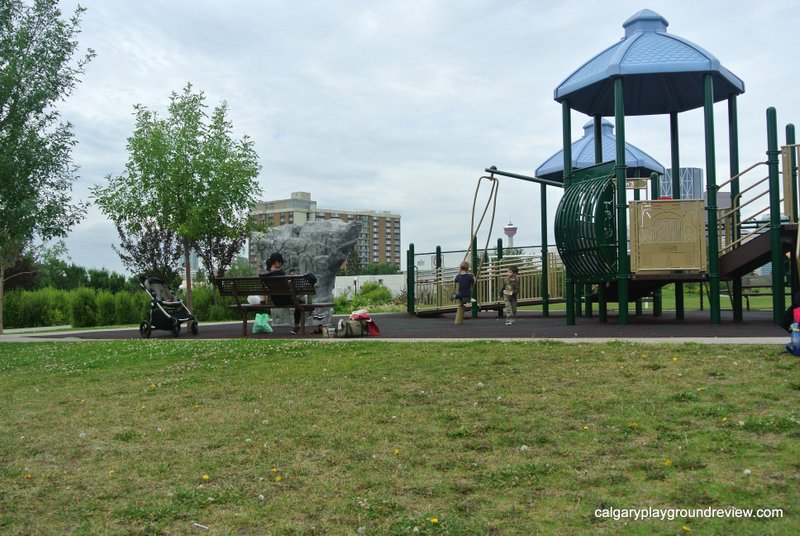 Surrounding Park Area: Flat grassy areas; soccer field; steep hill; young trees. The park is located where the Calgary General Hospital used to be.