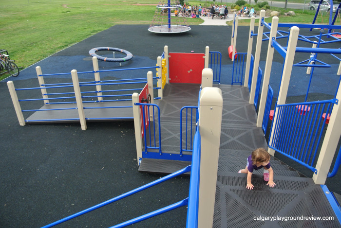 Accessibility: Entire playground has accessible flooring. There is also a ramp up to the first level – the platform has enough room to turn around in a wheelchair and activity panels that you can be accessed.