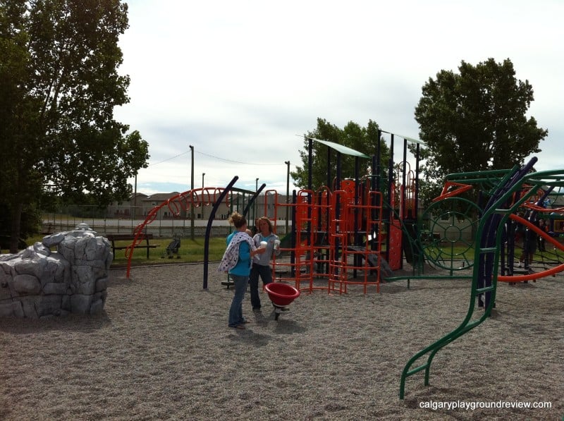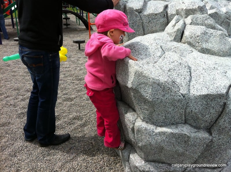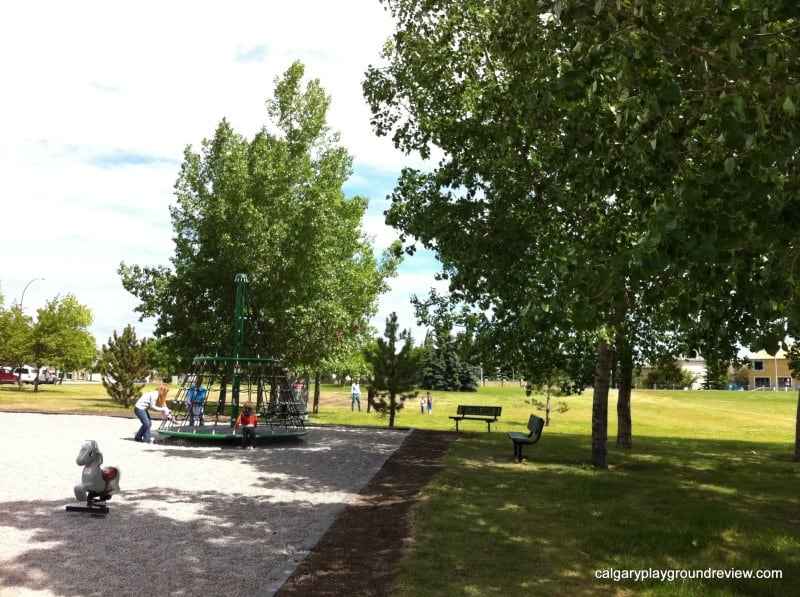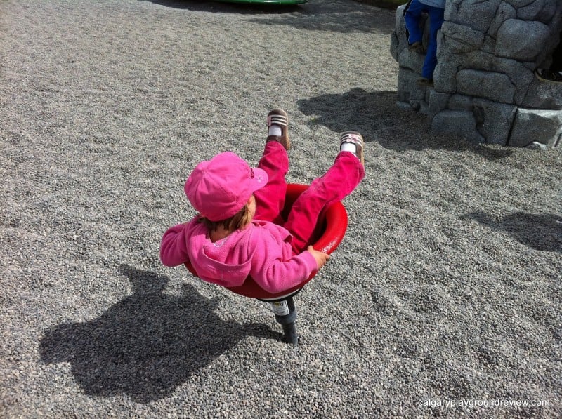 There’s a rock structure in the middle of the playground to enable kids to ‘rock climb’ without the need for extra support. The new type of merry-go-round has been installed at this playground, which rotates and has ropes supported by a pole up the middle. It was really hard to spin by the adults, but likely wouldn’t be if there wasn’t many kids on the structure.