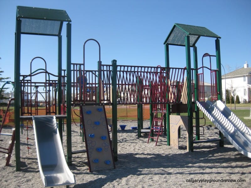 Features: Large climbing structure with 2 spinners, catwalk, big and little slides, store and house imaginative play panels; saucer swing; merry-go-round spinner.