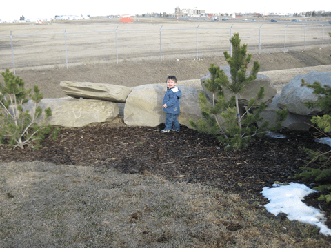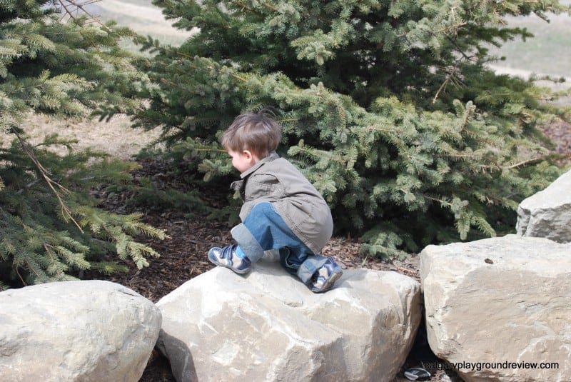 Park Area: The park area has some large rocks, evergreen trees and mulch. There is also a deep ditch that some kids find entertaining to run up and down but it can be full of water or garbage.