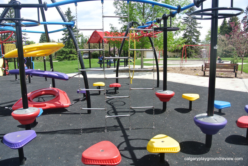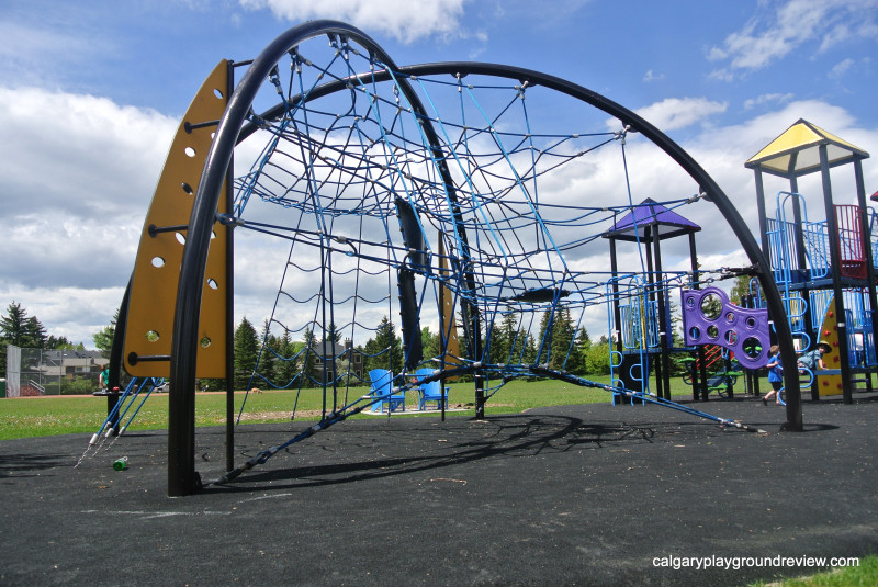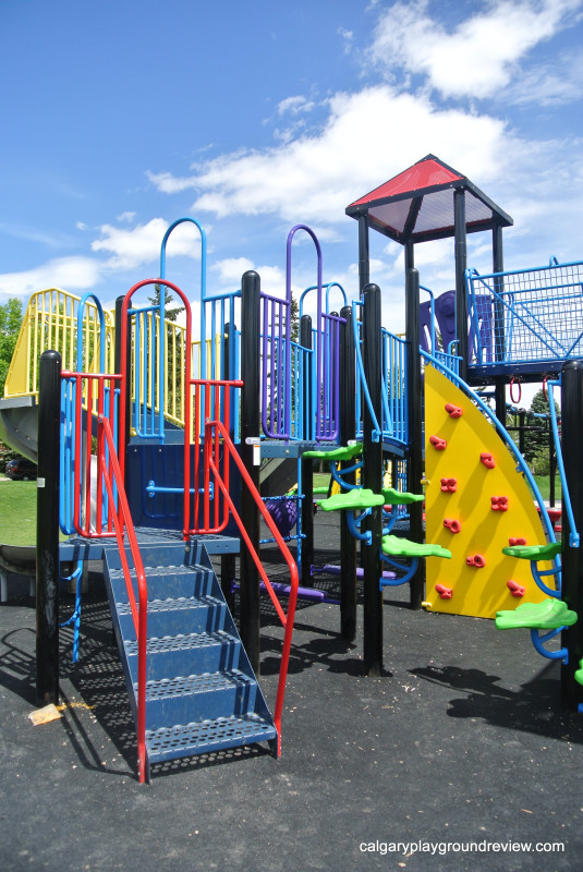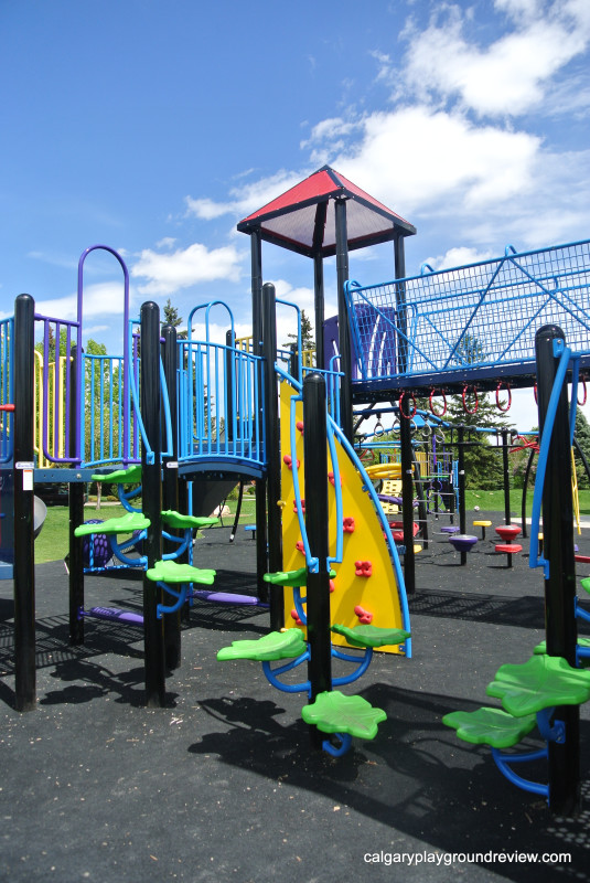 The equipment at this playground is plentiful and bright, but what really makes this playground stand out is the attention paid to the park area surrounding the playground. There are small hills, large rocks, pathways and hills making this more than just a playground.