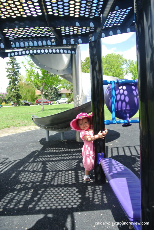 Shade: Pretty good in the park overall, but most of the trees right next to the playground are still young. The playground itself provides some descent shade and there is a covered picnic area.