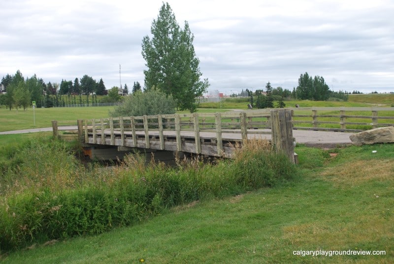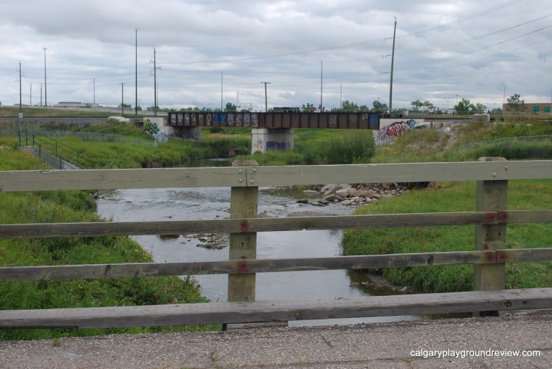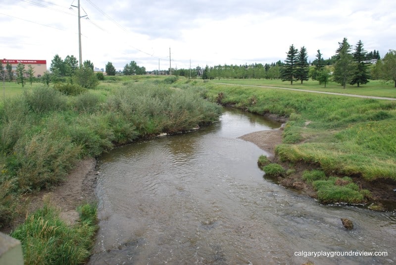 View of Nose Creek looking to the South. There’s a small area to the South of the bridge where you can get right up to the water. To the East of the Creek there is a large grassy area.