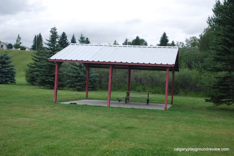There is a covered picnic area near the playground that has one picnic table.