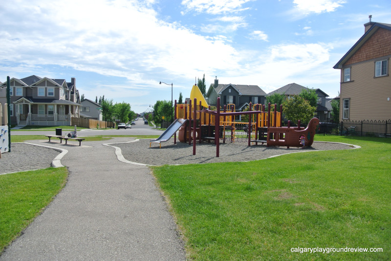 Surrounding Park Area: The playground is inside a small park with a few young trees,  some flat grassy space and a bike path down the centre. Shade: great shade underneath the play structure but little otherwise. The nearby trees will provide more shade as they mature.