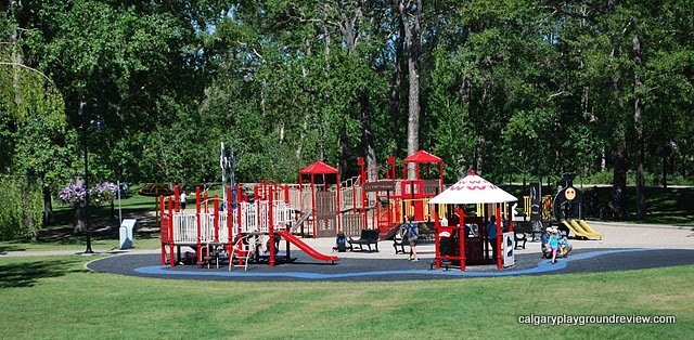 Prince’s Island Park (Just North of downtown) (Playground is in the Centre of the Island near the bridge on the North side). It is not possible to get to the playground without a bit of a walk.
