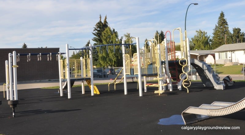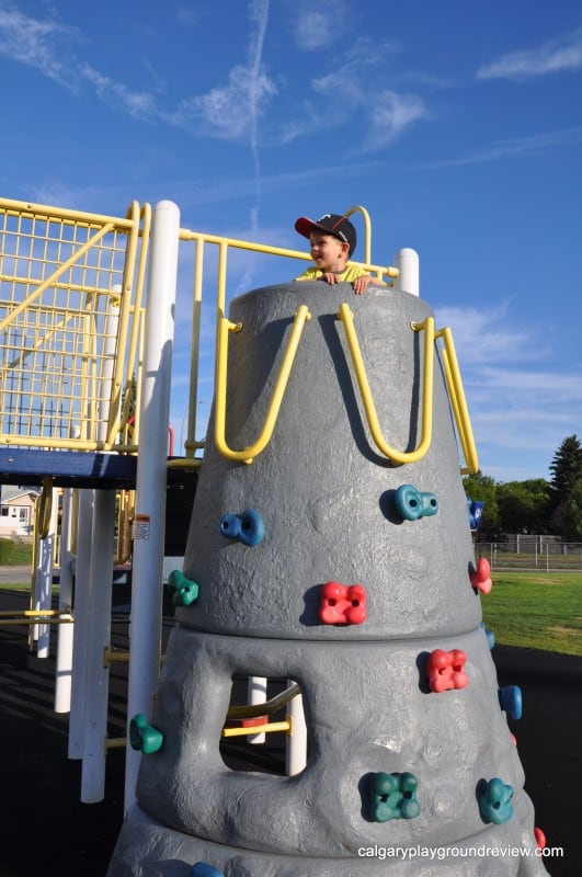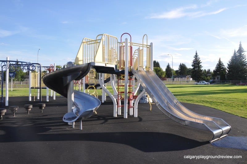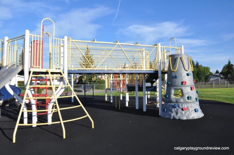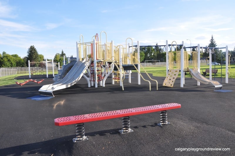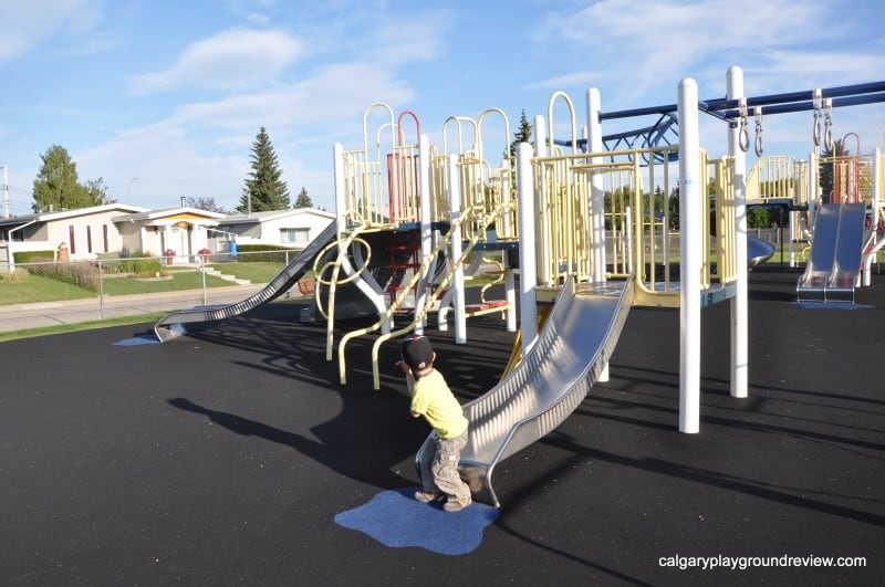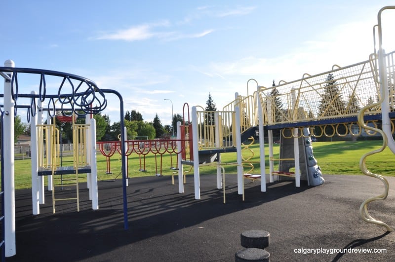 The catwalk and mountain climbers provide great opportunities for pretend play, and the inter-connectedness of much of the playground are perfect for games of keep off the ground. If your kids love a good challenge, but you hate how dirty your kids playing on playgrounds with pea gravel – this is the place for you.