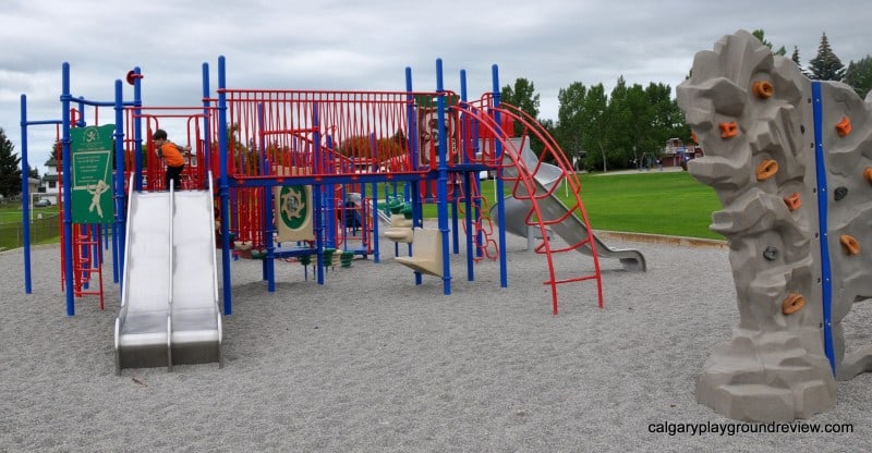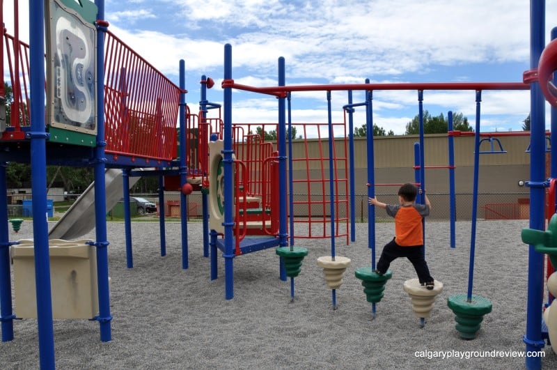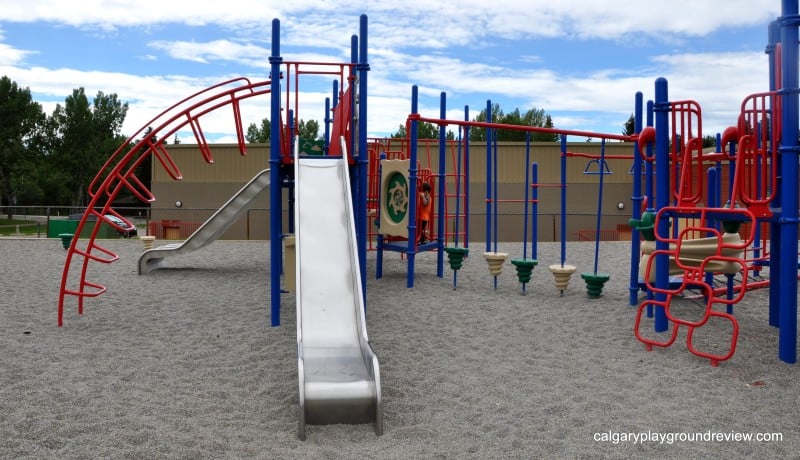 Surrounding Park Area: The playground is located up a small hill from the school itself. There are school fields beside it and a bike path runs along the east side. On the west side there is a small public playground with a couple of swings.