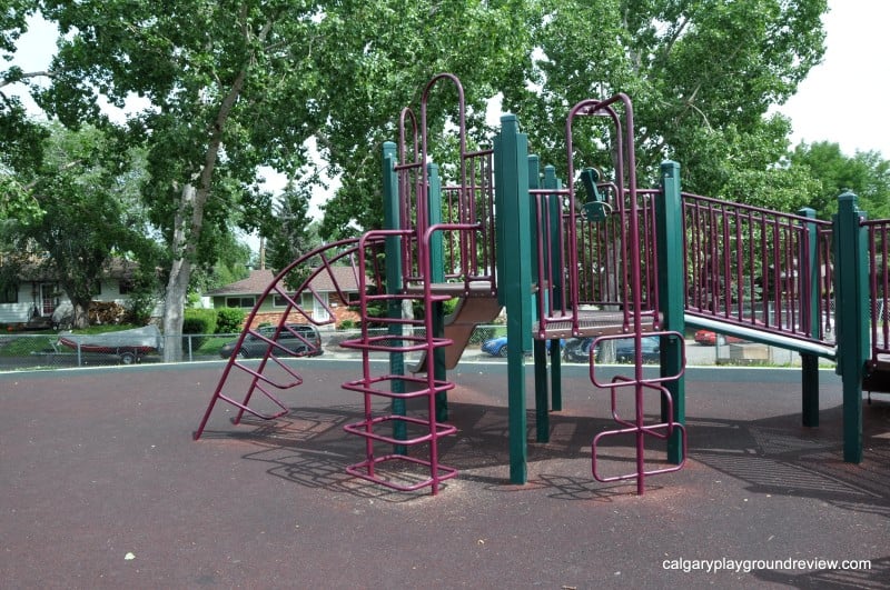 Surrounding Park Area: Next to a school, the playground is within a large fenced field area.