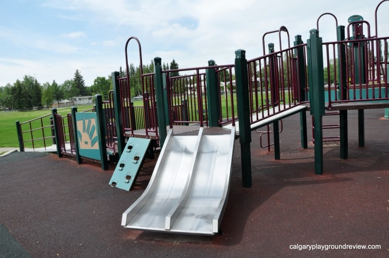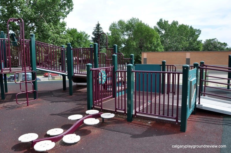 There is no accessible way to get from the preschool climber to the rest of the playground, however, so you would have to go back to the grass to get there. Overall, this playground is not set up well for kids in wheelchairs or who are otherwise unsteady on their feet.