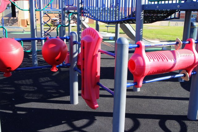 This playground is truly enormous. There are unique features such as a rope ladder leading to a rope bridge, and monkey bars that each swing back and fourth individually.