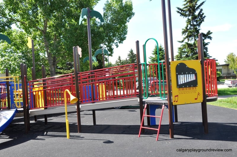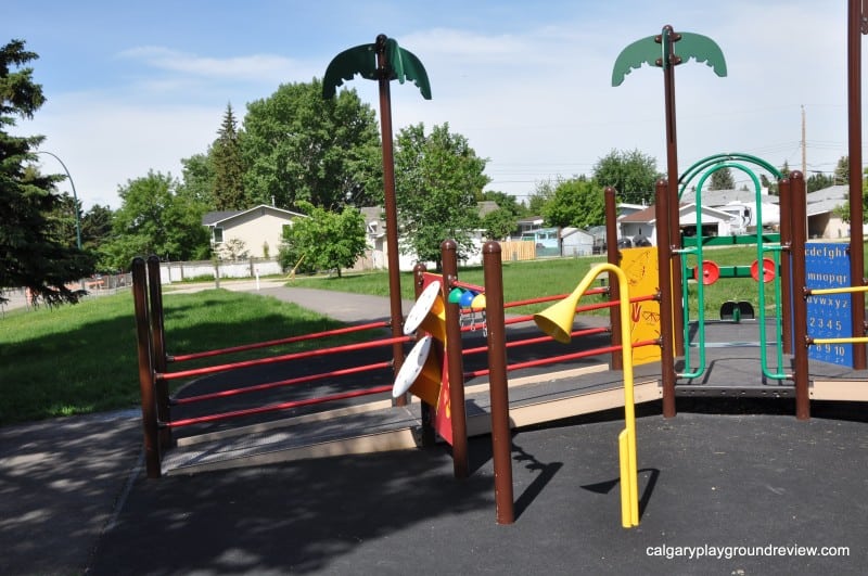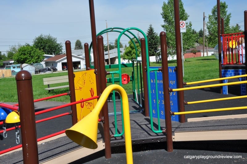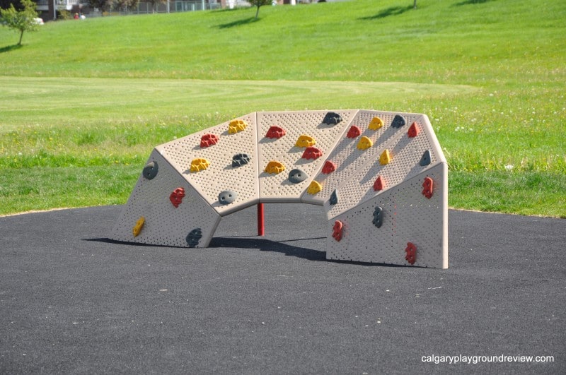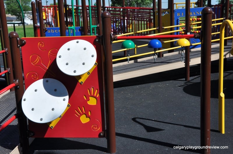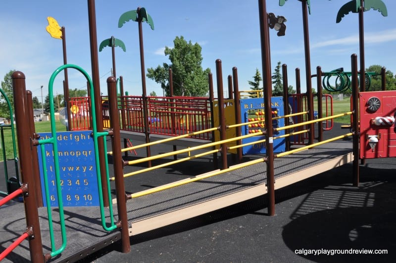 Accessibility: This is one of the most accessible playgrounds in the city. The flooring is 100% accessible, and ramps provide access to all but one small section of the climber. In addition, at each ‘intersection’ of the climber there is enough room for a wheelchair to turn around, and there are a lot of fun activity panels to play with. There is also a number of things that bounce or swing for kids who benefit from vestibular stimulation.