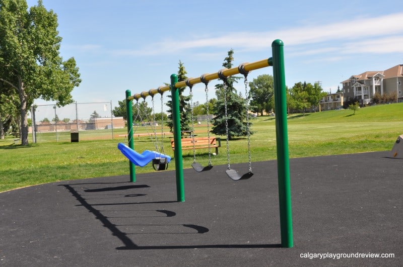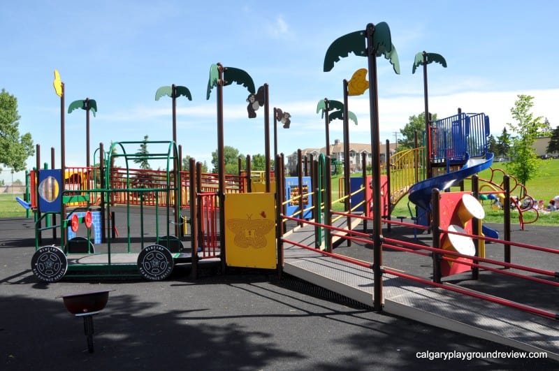 Features: preschool play structure with ramps (3 levels), slides and activity panels, 2 seater bouncer, 4-seater bouncer, toddler climbing wall, bowl spinner, 4 swings(1 baby, 1 accessible).